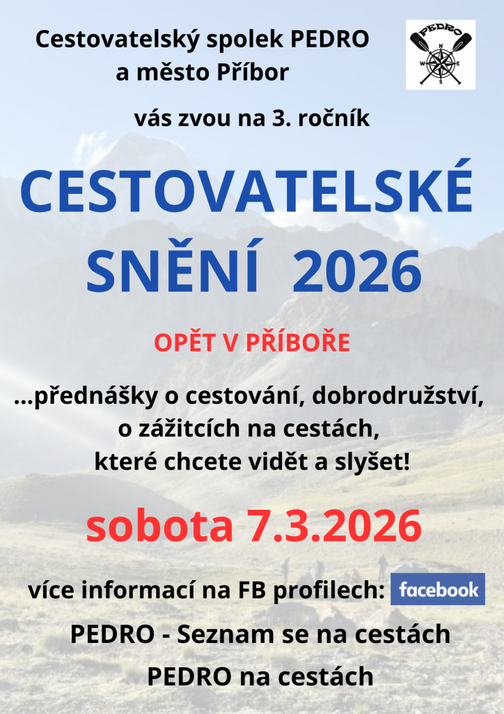 Cestovatelský spolek PEDRO a Město Příbor vás zvou na 3. ročník přednáškového festivalu o cestování, dobrodružství, o zážitcích na cestách, které chcete vidět a slyšet!